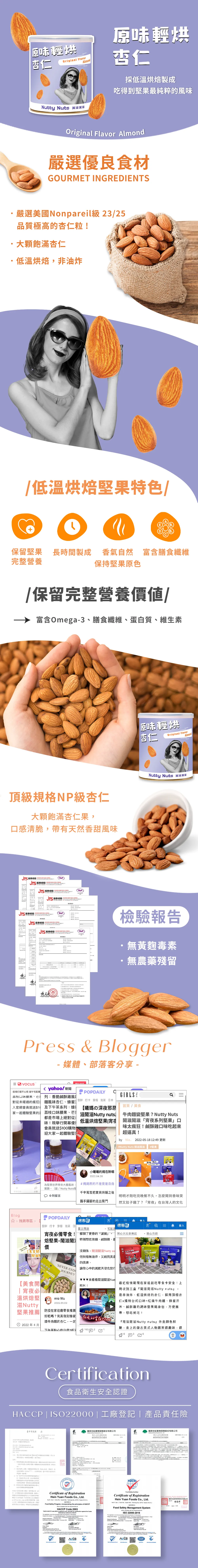 ✧ 享受無負擔の好滋味 !✧ 嚴選「美國加州杏仁果」選用最高等Nonpareil級 23/25,品質極高的杏仁果 !✧ 採用低溫烘焙非油炸,保留堅果營養